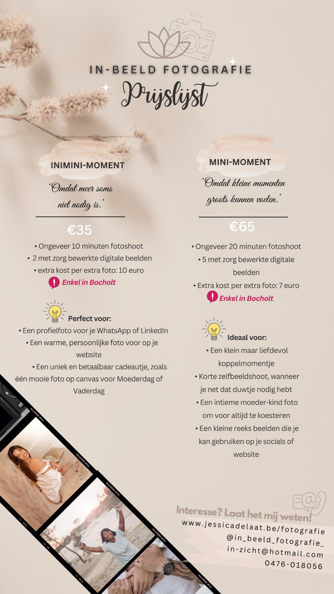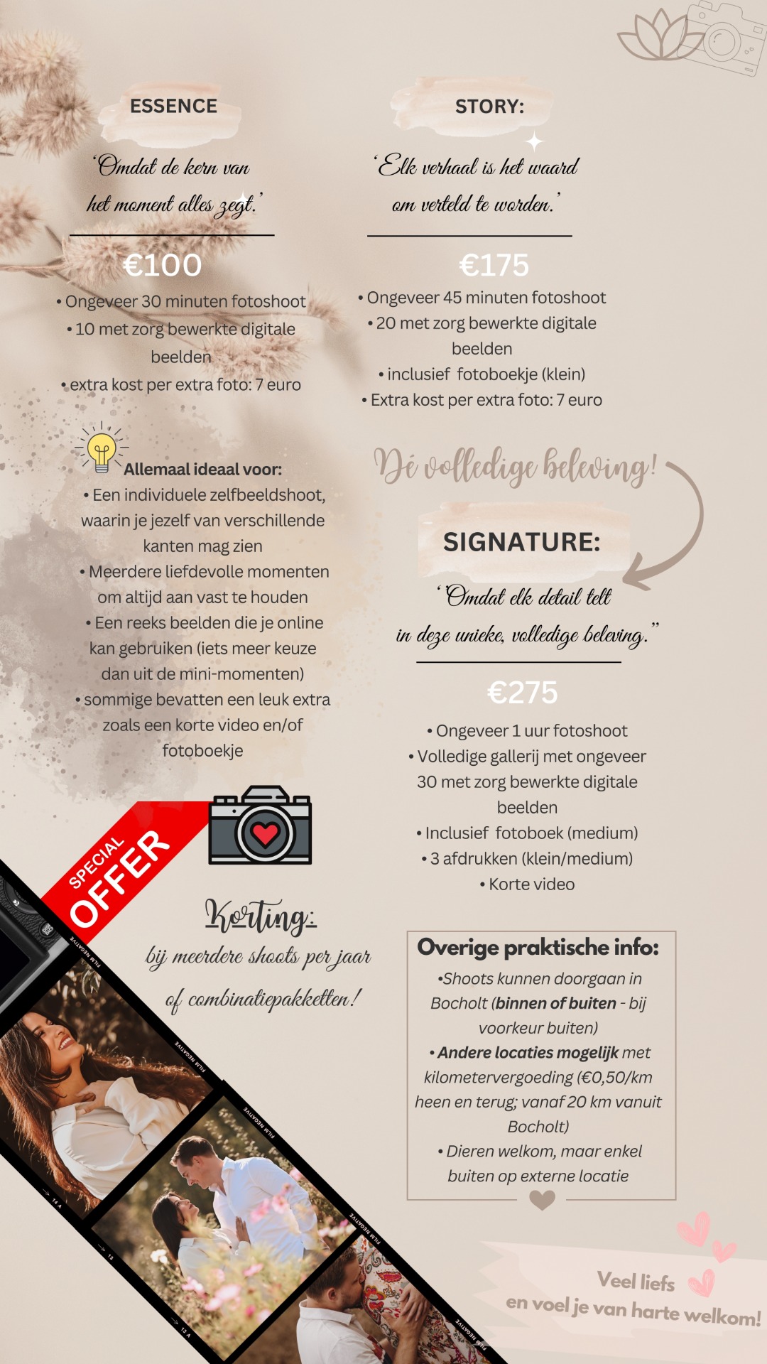• Kennis en ervaring: Al mijn jaren ervaring en creatieve oog zijn onderdeel van de shoot. Ik zie en leg momenten vast die jij misschien zelf niet zou opmerken.